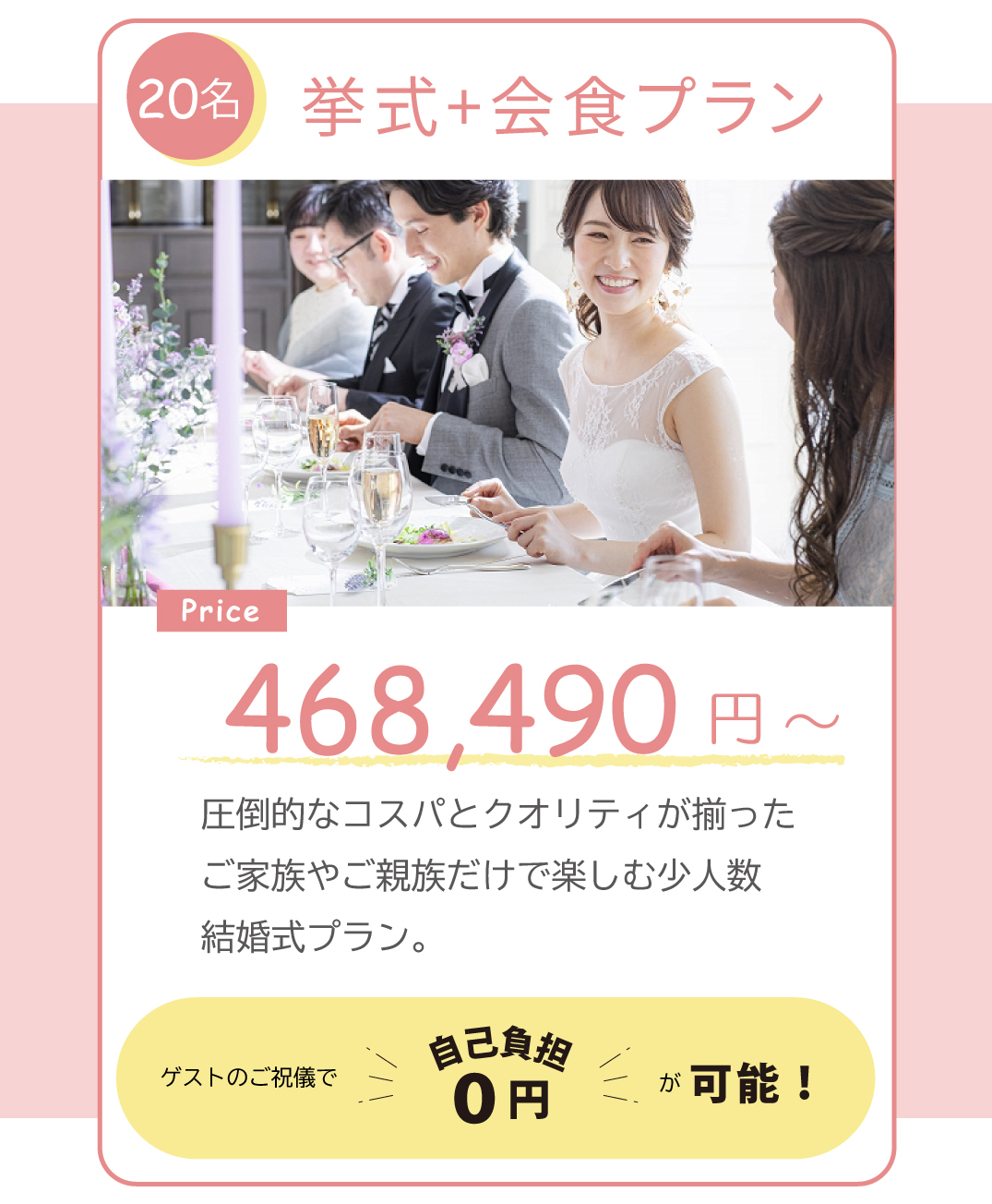 挙式のみ99,000円~。20名の挙式+会食なら自己負担0円で可能!